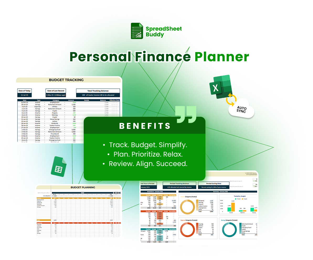 The Personal Finance Tracker is your ultimate tool for effortlessly managing income, expenses, and savings. By organizing your finances into clear, actionable categories, this tracker helps you stay on top of your financial goals. Whether you're looking to budget for necessities, save for the future, or track discretionary spending, this personal finance planner simplifies the process. Accessible on all devices and compatible with Google Sheets and Excel, it ensures you’re always in control of your finances—no matter where you are.