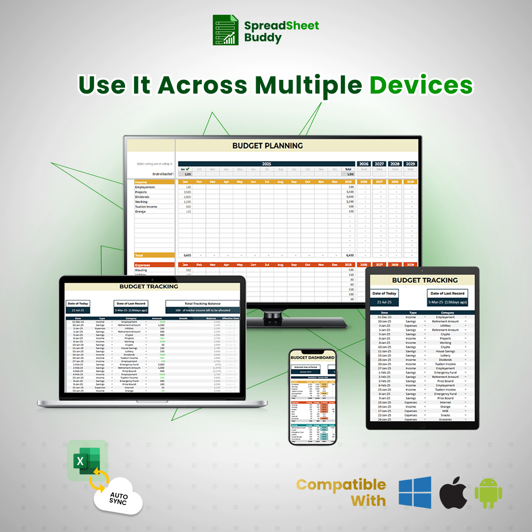 ✅ Track multiple income streams and expenses and manage up to 40 categories for accurate budgeting.
